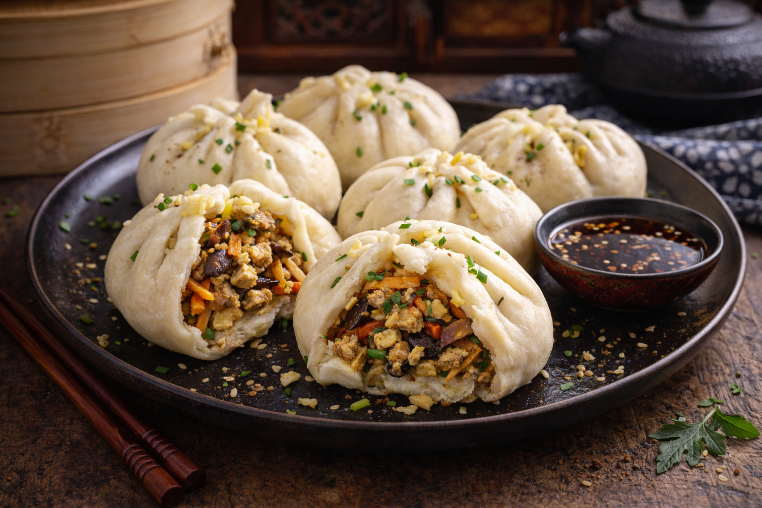 Trasferisci i bao caldi sul piatto e servi con la salsa di accompagnamento. Puoi completare con erba cipollina tritata o semi di sesamo tostati per dare croccantezza.