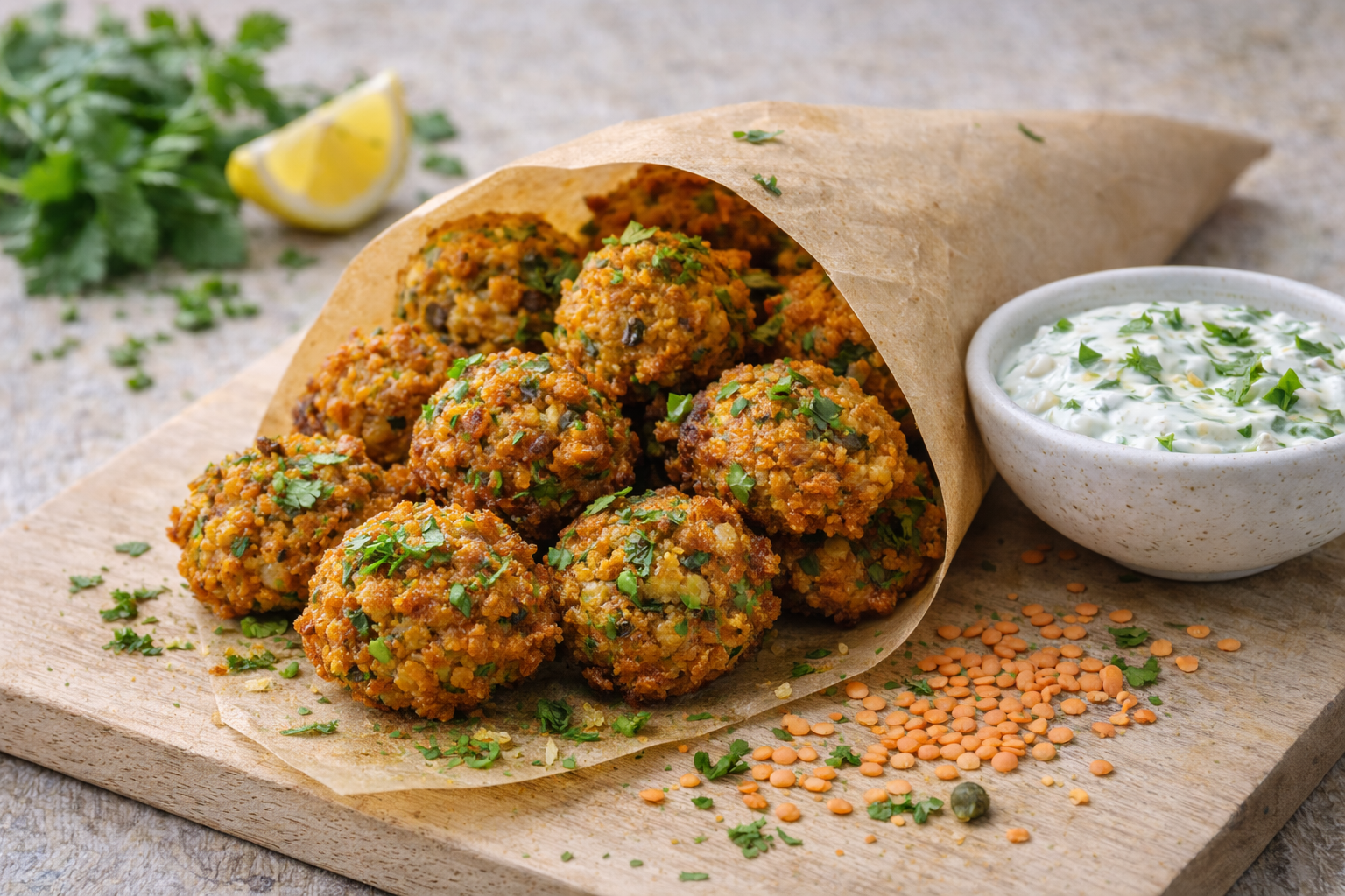 Queste frittelline di lenticchie rosse sono un'idea versatile per l'aperitivo, un pranzo leggero o per accompagnare un'insalata verde. I sapori sono caldi e speziati: il cumino e l'aglio esaltano la nota dolce delle lenticchie, mentre il coriandolo fresco aggiunge una freschezza erbacea.