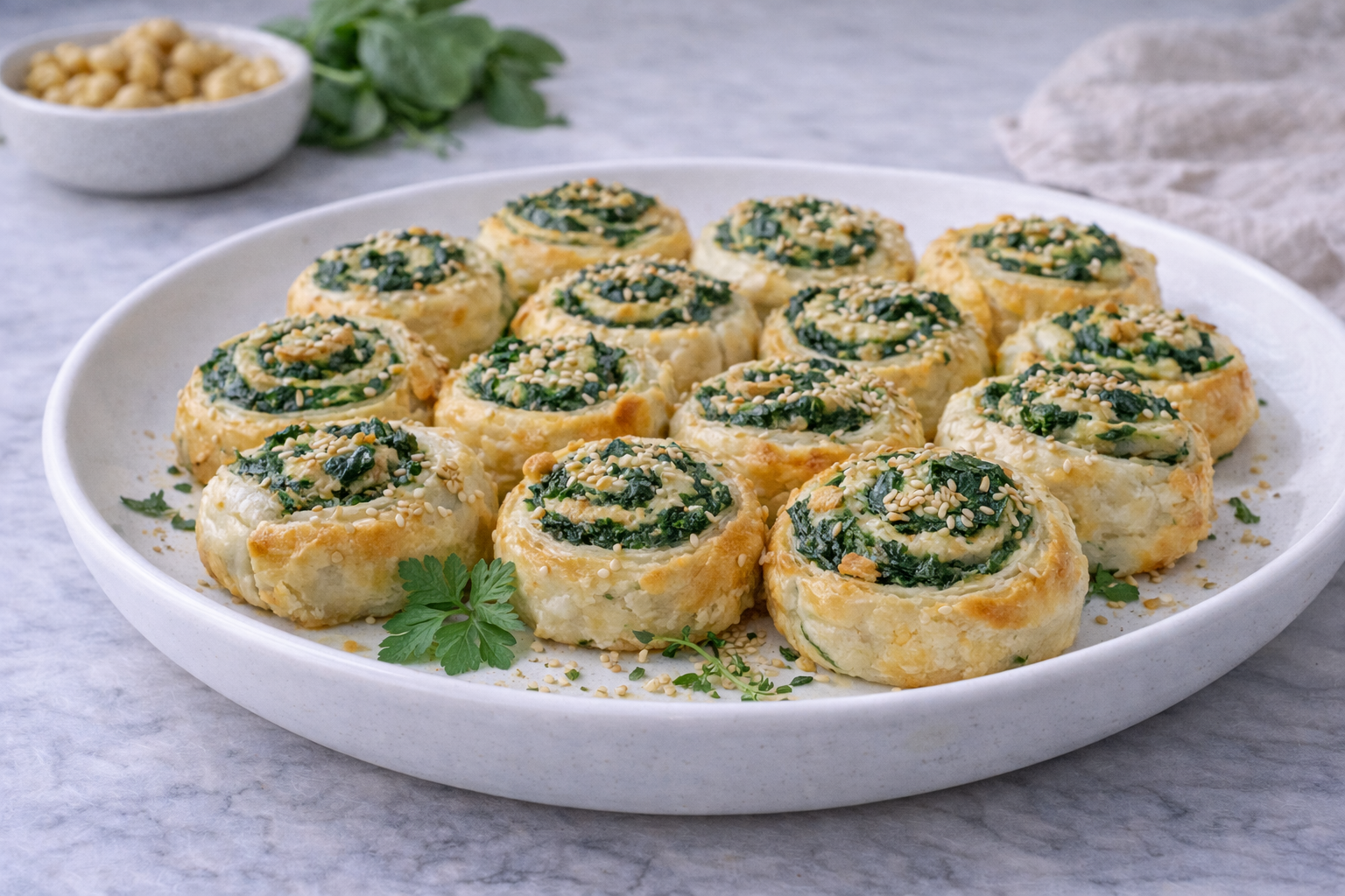 Le girelle di pasta sfoglia con spinaci e semi di sesamo uniscono la semplicità degli ingredienti a un risultato molto scenografico: croccanti all'esterno e morbide all'interno. Sono l'ideale per un aperitivo con amici, come antipasto in una cena rustica o per arricchire un buffet finger food.