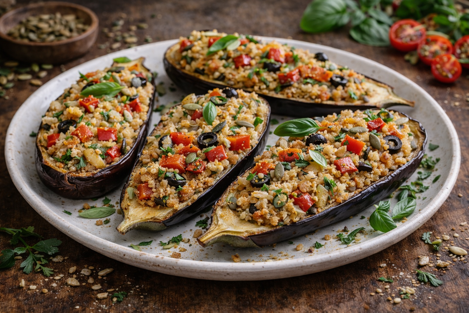Lava le melanzane, tagliale a metà per il lungo e svuotale lasciando circa 1 cm di polpa lungo i bordi per creare una barchetta. Metti le metà su una teglia rivestita di carta forno, spennella l'interno con un po' d'olio e condisci con sale e pepe.