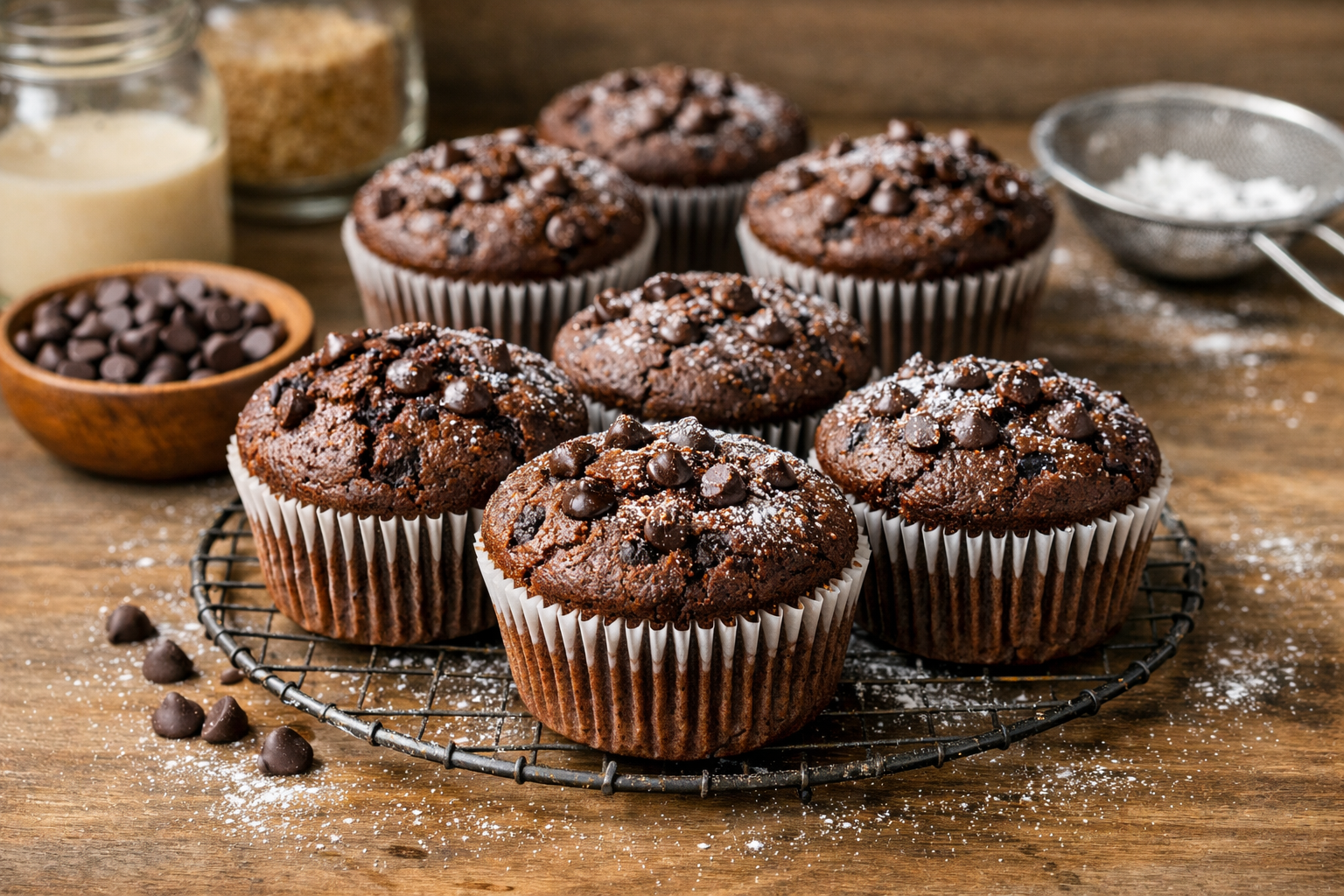 Questi muffin al cioccolato sono morbidi dentro e leggermente croccanti fuori: il contrasto tra la mollica soffice e le gocce di cioccolato rende ogni morso goloso. Sono ideali per una colazione energica o per una merenda da condividere con amici e famiglia.