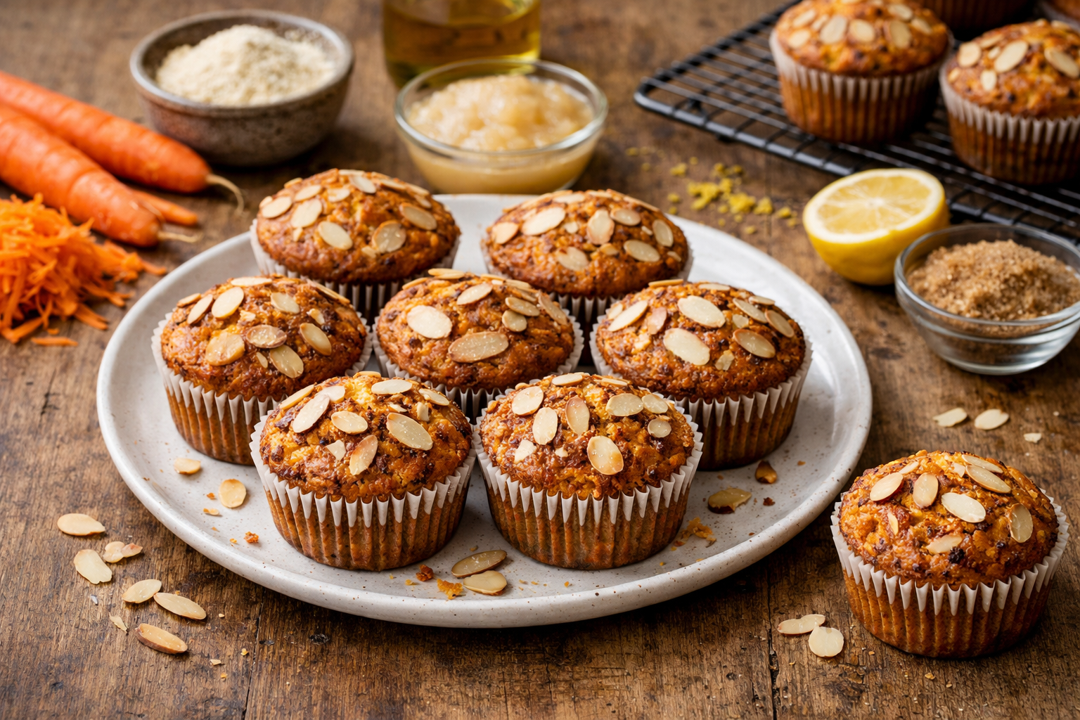 Questi muffin alle carote e mandorle sprigionano un profumo avvolgente di cannella e agrumi. La farina di mandorle regala morbidezza e un retrogusto delicato che si sposa perfettamente con la dolcezza naturale delle carote.