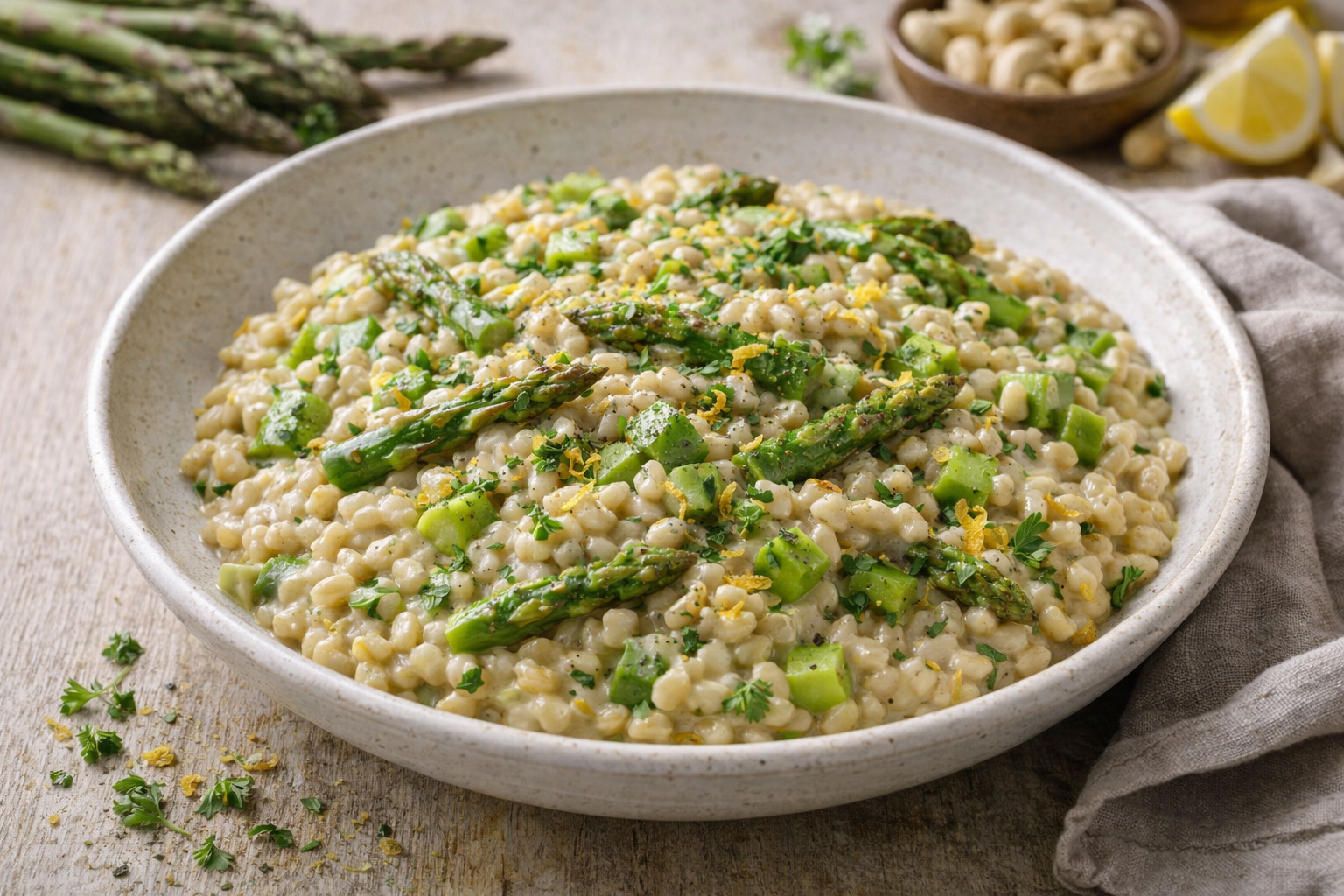 Servi l'orzotto caldo, guarnito con prezzemolo fresco e scorza di limone per un tocco brillante. È ideale nelle stagioni in cui gli asparagi sono al loro meglio, ma funziona bene anche con asparagi surgelati di buona qualità.