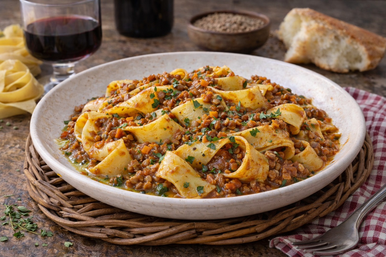 Questo piatto unisce la consistenza rustica delle lenticchie con la larghezza delle pappardelle, creando un contrasto di sapori e consistenze ideale per i menu casalinghi. Le note aromatiche del rosmarino e del vino rosso donano profondità, mentre la passata di pomodoro bilancia con dolcezza e acidità.