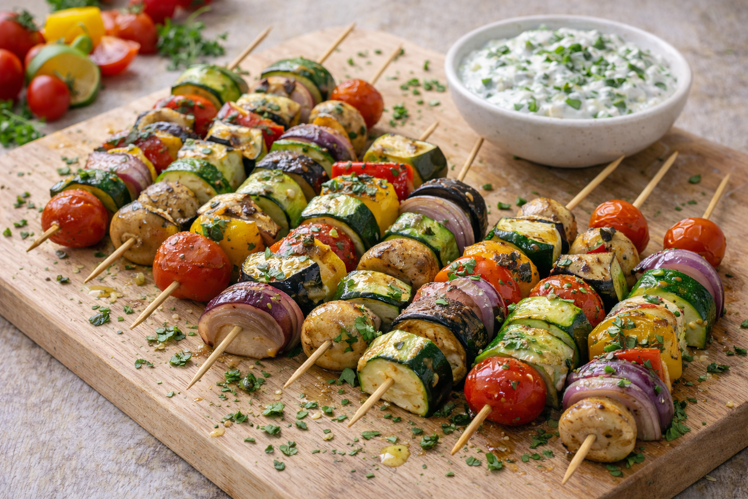 Lava e asciuga tutte le verdure. Taglia le zucchine e le melanzane a rondelle o a fette spesse circa 1 cm; pulisci i peperoni eliminando semi e parti bianche e tagliali a pezzi grandi; affetta la cipolla a spicchi e lascia interi i pomodorini e i funghi piccoli.