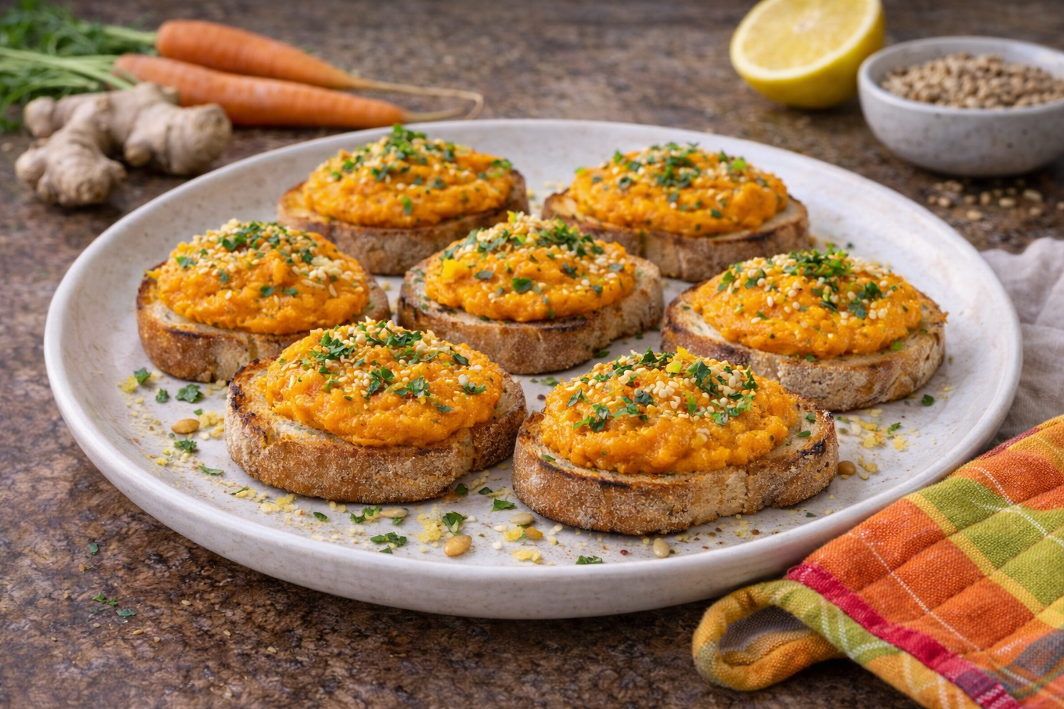 Queste tartine uniscono la dolcezza delle carote arrostite al tocco fresco e piccante dello zenzero, creando una crema morbida e saporita che si spalma facilmente sul pane croccante.