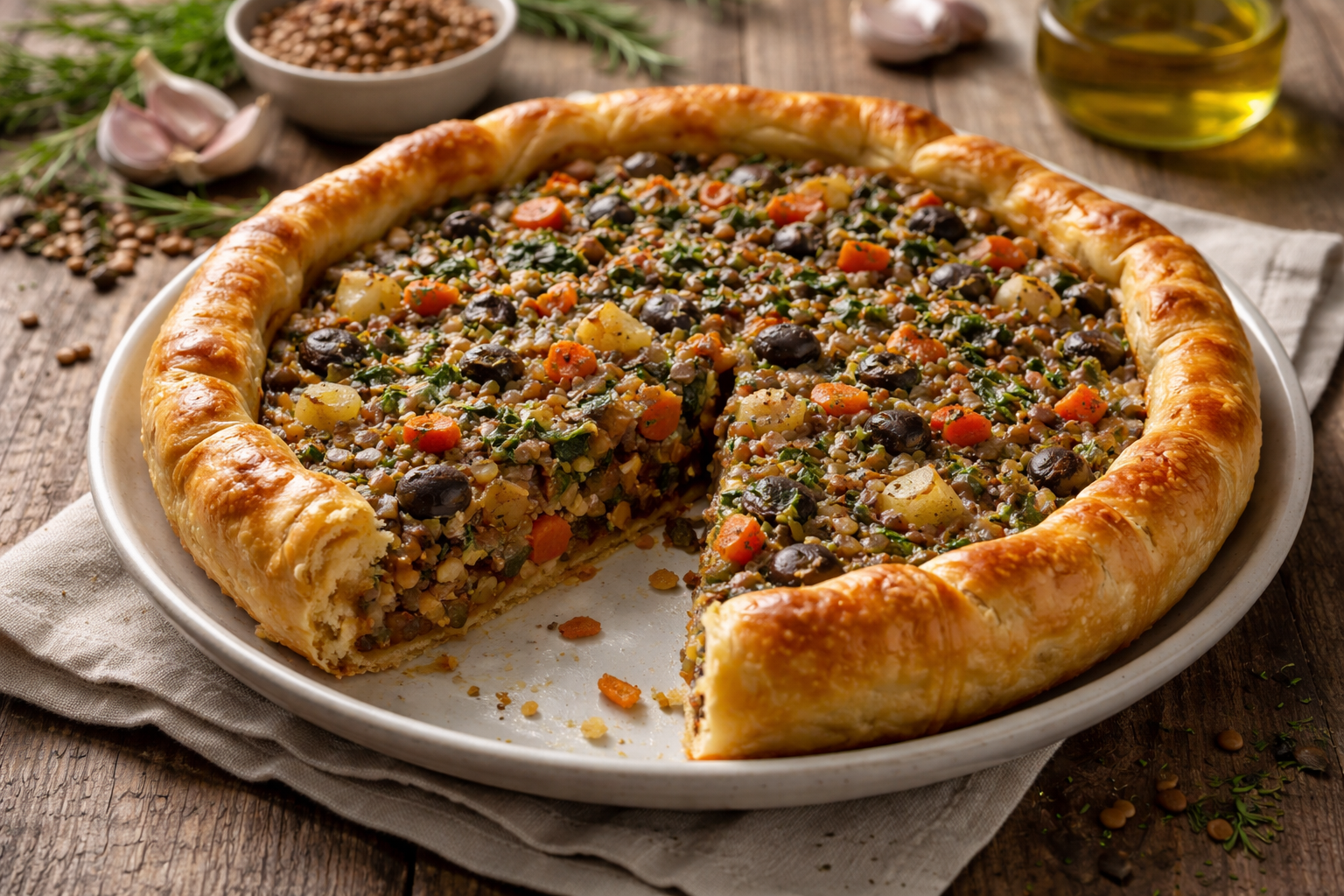 Questa torta salata unisce la consistenza rustica delle lenticchie a verdure saporite e aromi mediterranei. La pasta sfoglia croccante incornicia un ripieno morbido e profumato, ideale per un pranzo in famiglia o per un picnic.